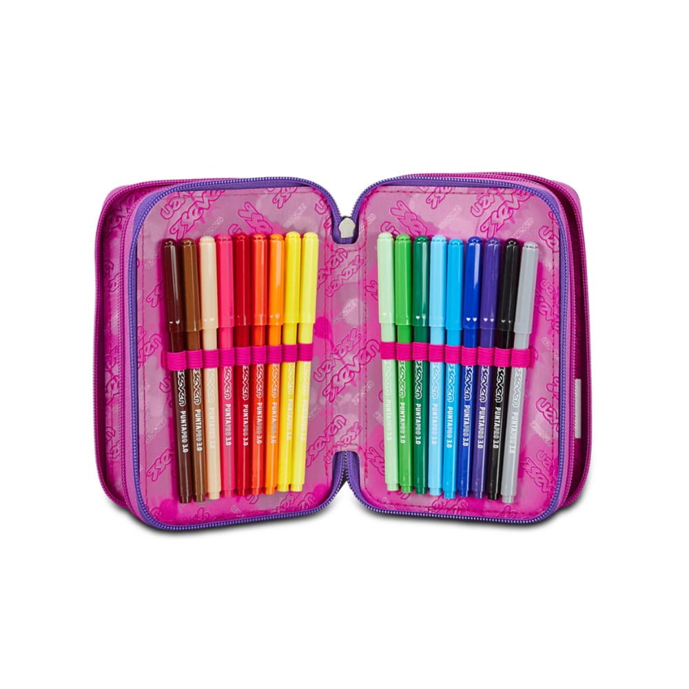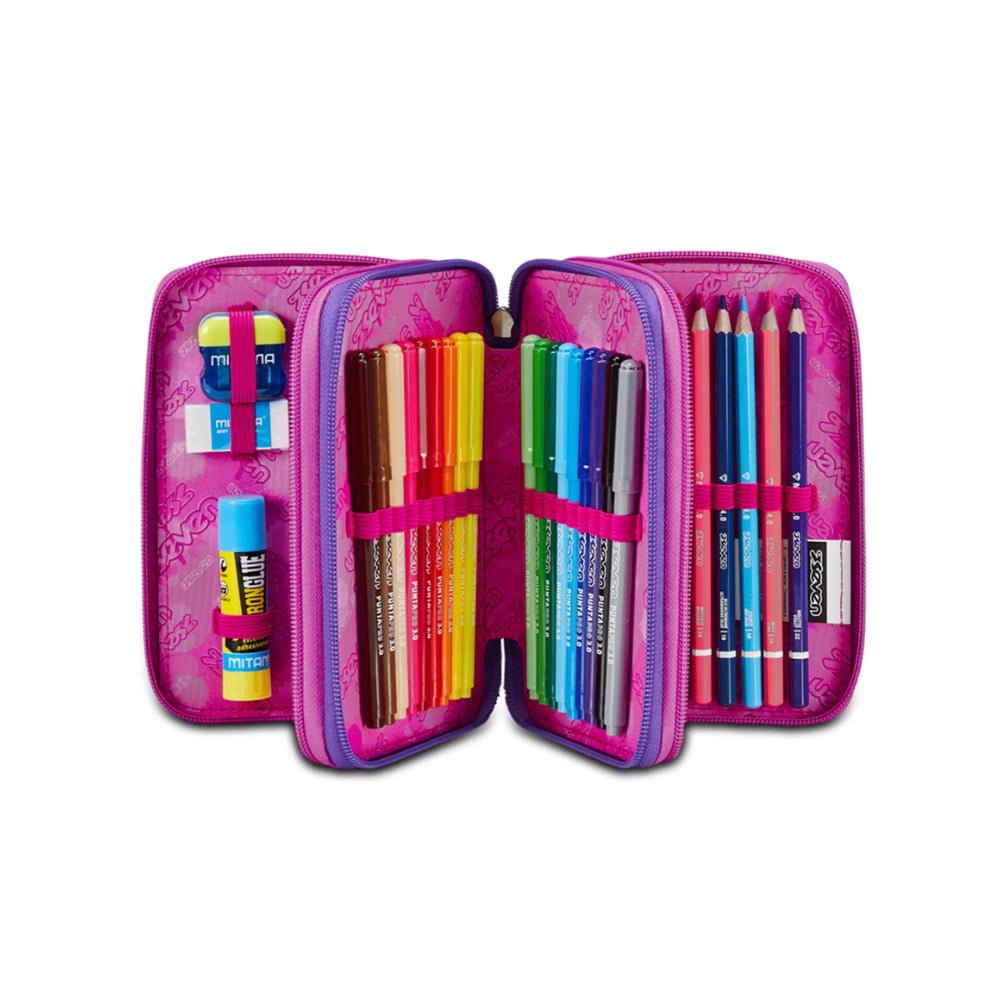 - Tasche: Triplo scomparto con elastici porta penne chiuso con zip.